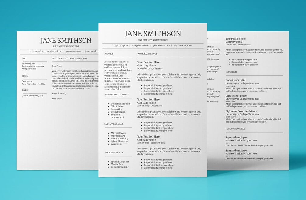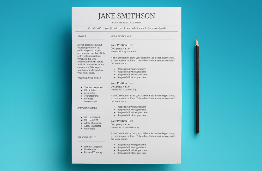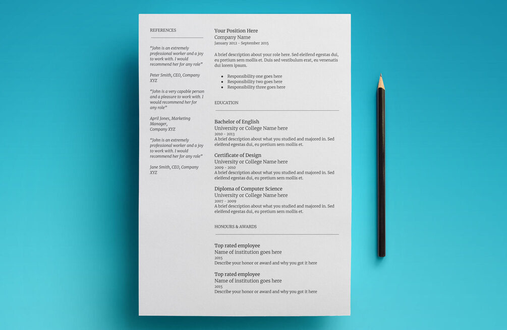 • Contact details, profile, employment, education, skills and awards and honours sections included