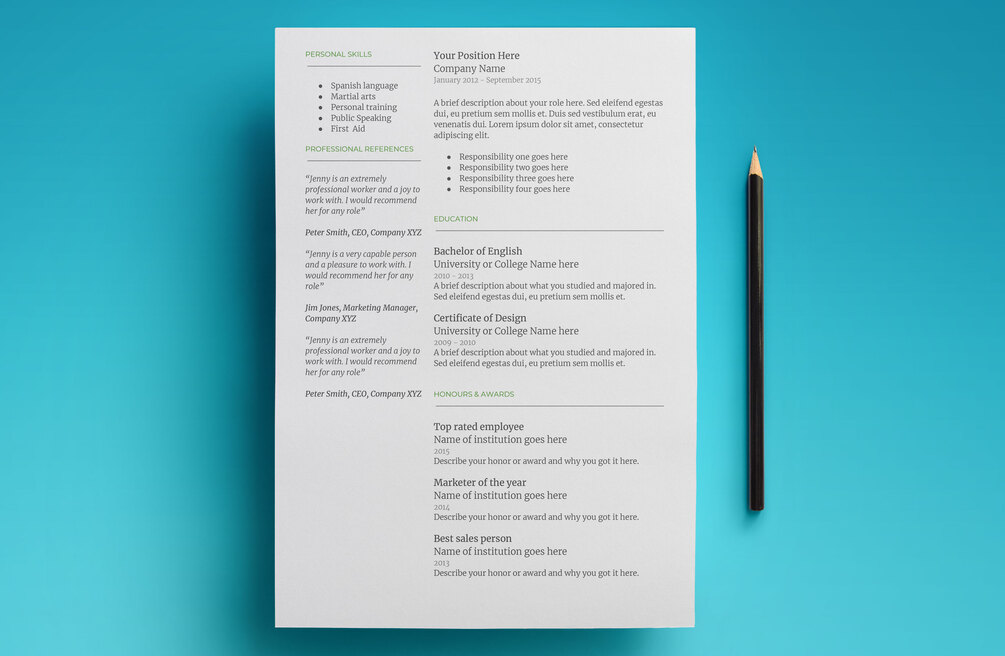 - Contact details, profile, employment, education, skills and awards and honours sections included