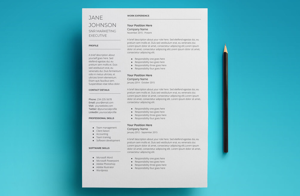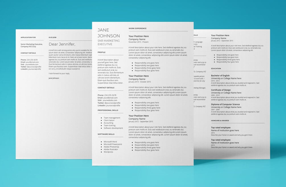 - Contact details, profile, employment, education, skills and awards and honours sections included